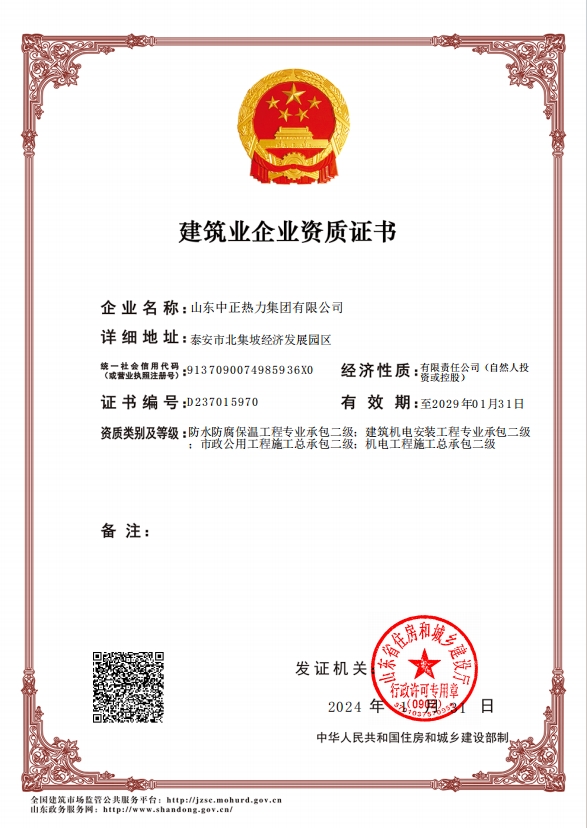 機(jī)電工程施工總承包二級(jí)、市政公用工程施工總承包二級(jí)、建筑機(jī)電安裝工程專(zhuān)業(yè)承包二級(jí)、防水防腐保溫工程專(zhuān)業(yè)承包二級(jí)